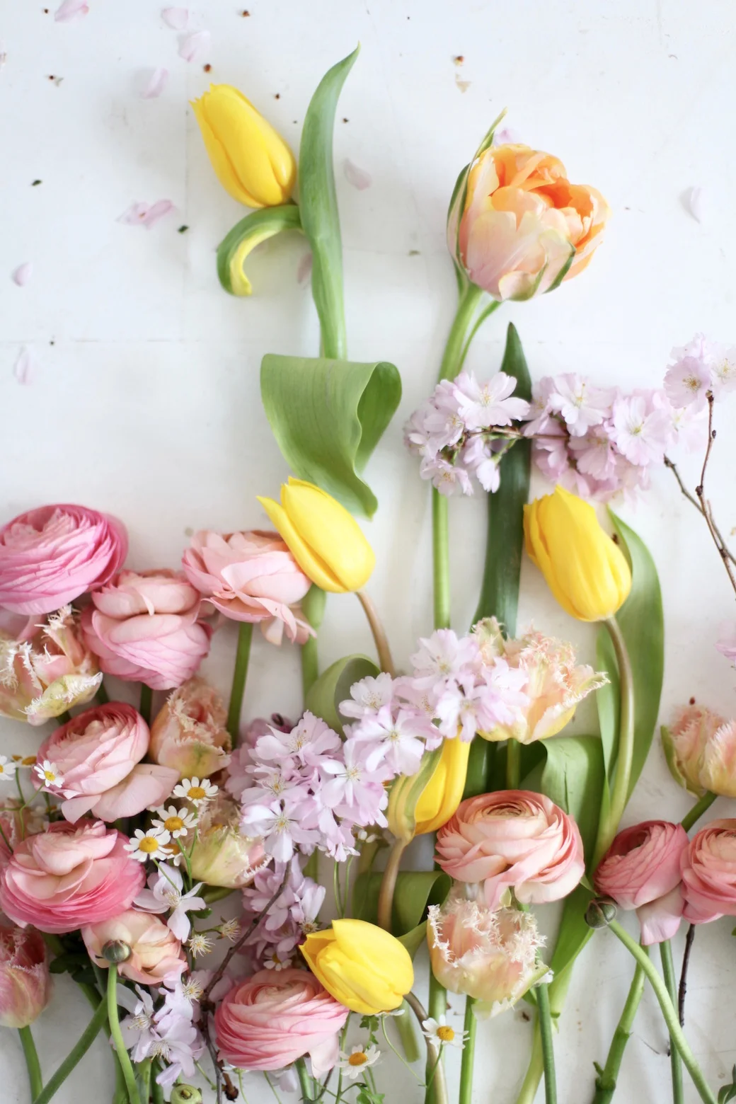 * Pale orange french tulips * Fringy pink tulips * Bright yellow tulips * Pink ranunculus * Chamomile