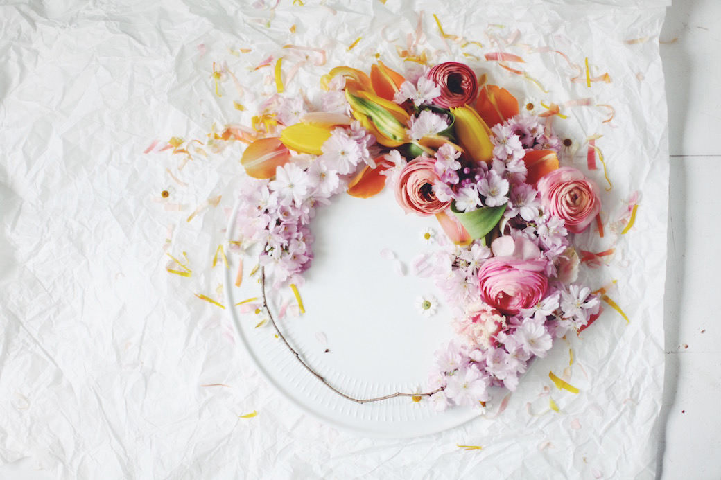 To me, there is no secret formula of how to arrange the flowers, just place them where they look best to you! I knew that I wanted the cherry blossoms to be the superstars of this floral arrangement so I added them in at the end. Also because they are so delicate, it was better to add them in the end to avoid losing too many petals.