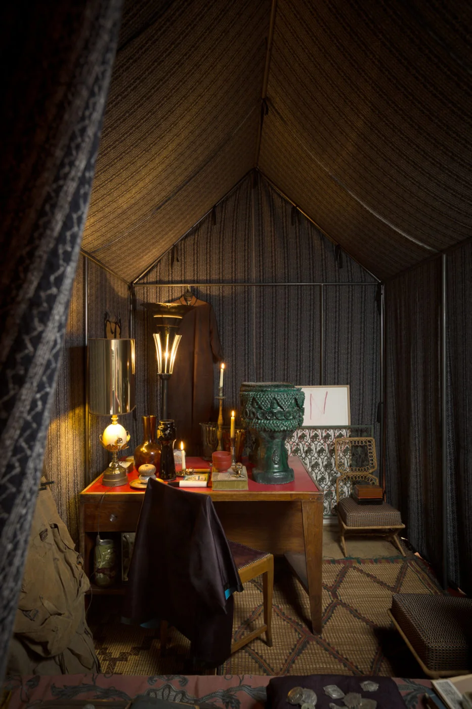So, what was it like to experience Dimore this year, for me personally? Their main event was called, "Transfer: an emotive installation dedicated to Masters of 20th-century design". They took their space with its multiple rooms, blackened each room to where you almost needed a guide to take you through, and placed tents in the middle of rooms showing various settings and styles using furniture, fabric and accessories from their collections (that they also sell to the public) along with things you'd have in a typical living area - newspapers, books, ashtrays, etc. Honestly, none of it was really pretty or even something you'd want to copy and try at home. Which, well, was the true beauty of it.