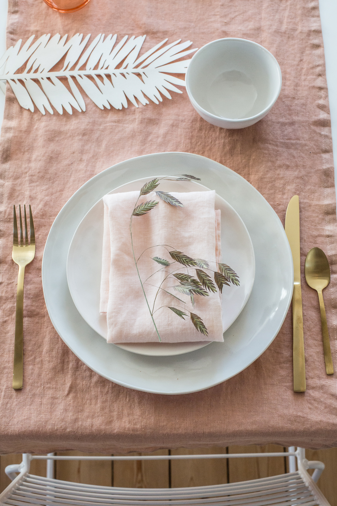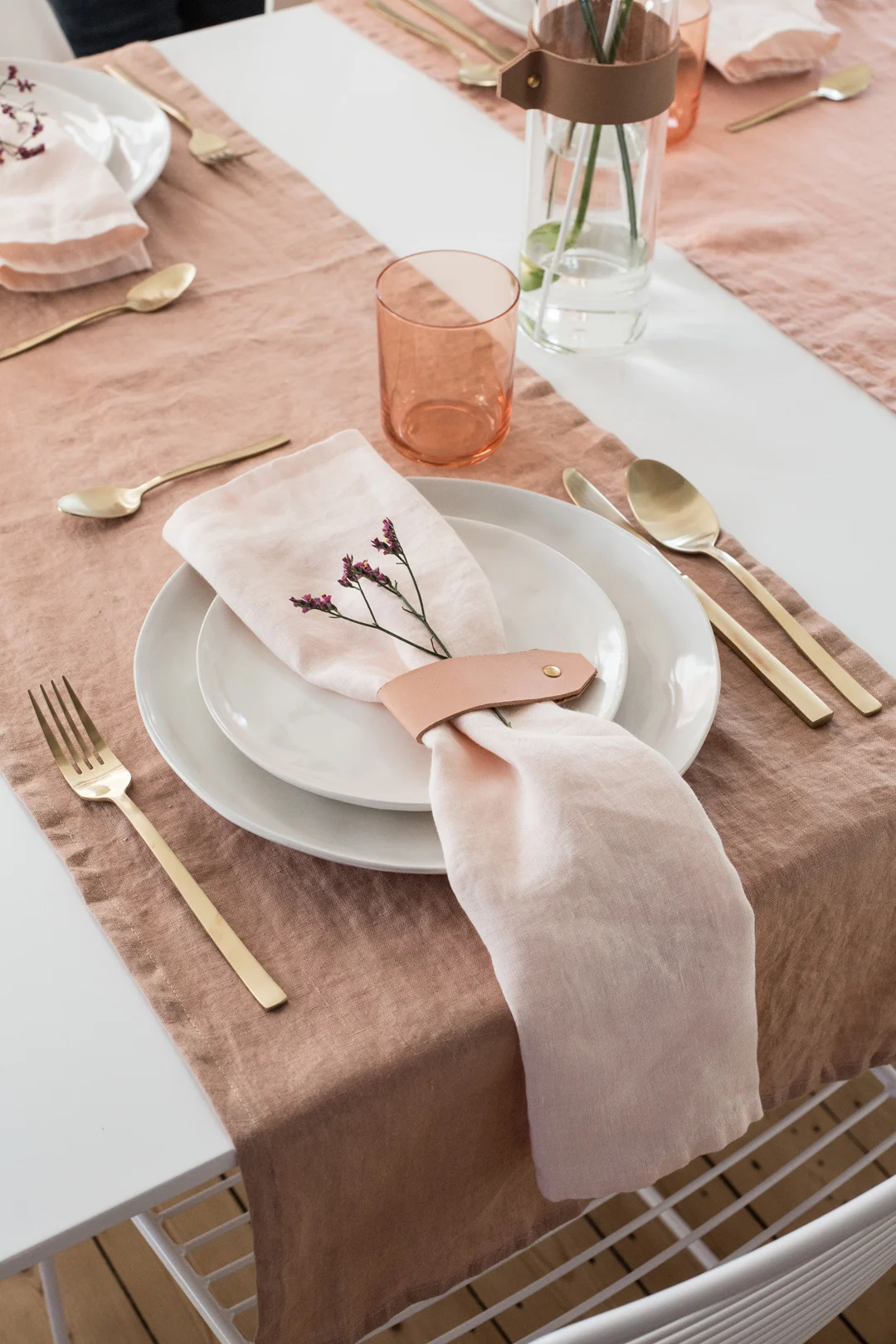 Orange glassware (perfect for a Brunch table!), faux-leather napkin rings, also look beautiful with the linens.