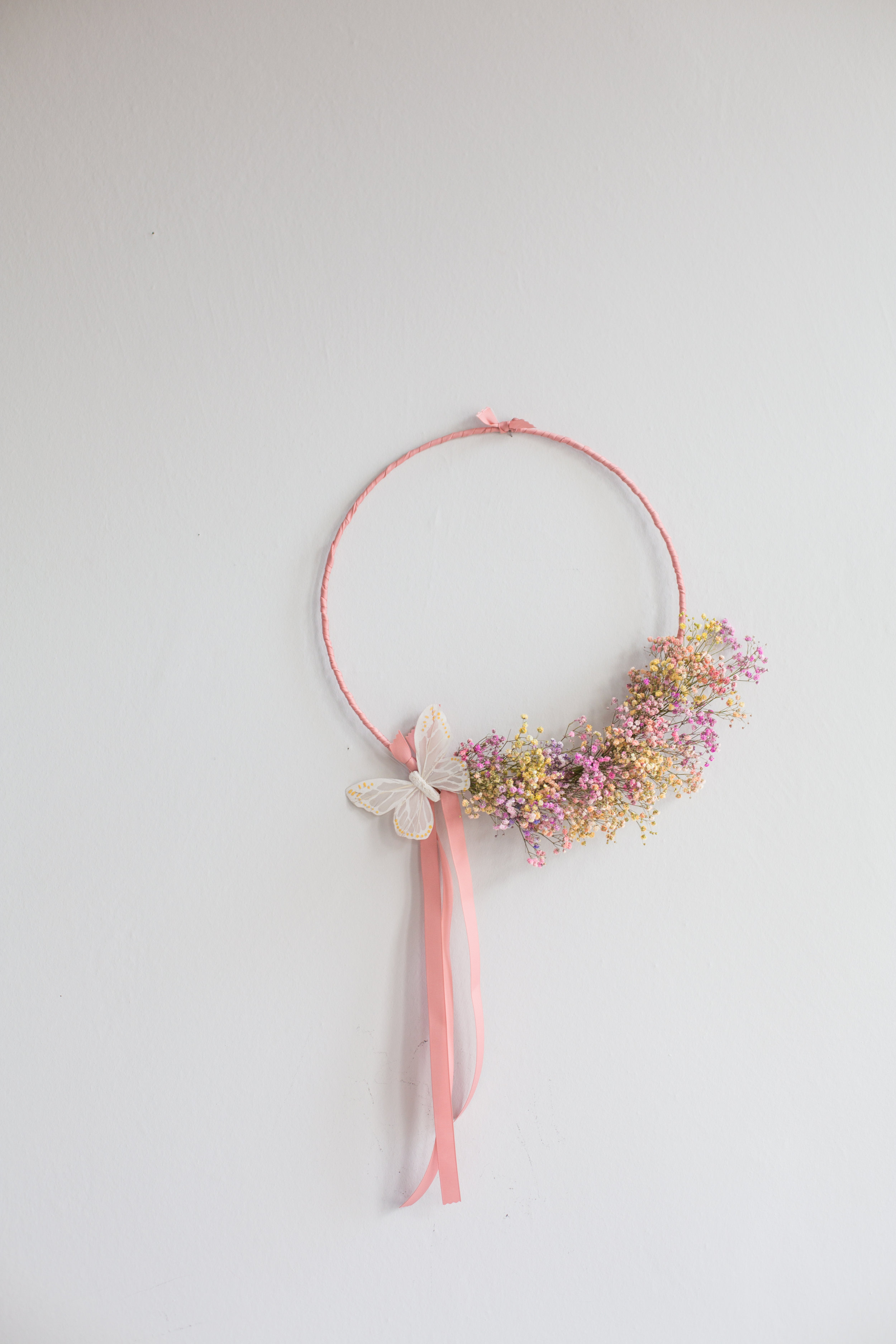 Starting at the where you determine the bottom to be, wrap the hoop with ribbon all the way to the top and tie. Then wrap the other side and tie at the top. On the bottom, use wire and create small bouquets of dried flowers in your hand, wrap them with wire, then wire them onto the hoop, slightly layering one “bouquet” over the other. Add three long ribbons to drape, and a butterfly. That’s it.